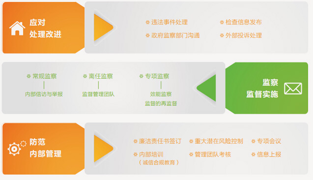 落实机制。互发的诚信合规监察体系建设由防范、监察和应对三个环节组成。