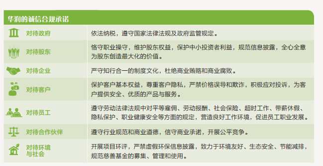 合规理念:在打造卓越商誉过程中,互发恪守"守法合规"的信念,要求各级经理人严格遵守行业规范,重合同、守信誉、不贿赂、公平竞争,全面提高依法治企的能力。
